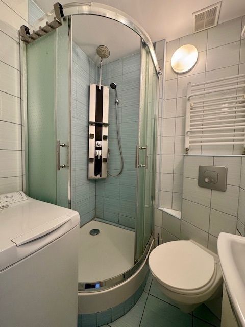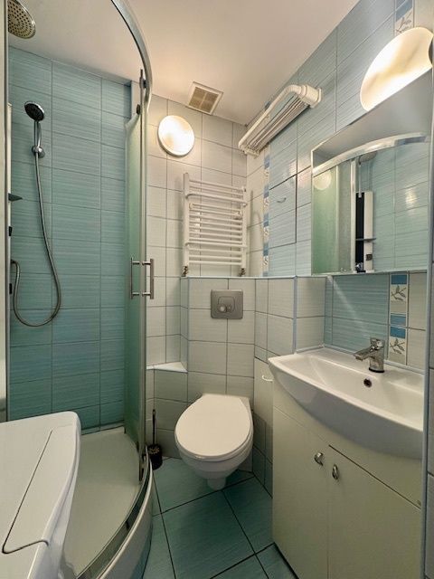 Mieszkanie o łącznej powierzchni ok. 38 m2 składa się z 2 niezależnych pokoi, kuchni wyposażonej w zmywarkę, dużą lodówkę, piekarnik, okap i pralkę, łazienki z kabiną prysznicową oraz przedpokoju.