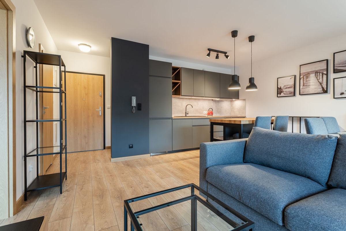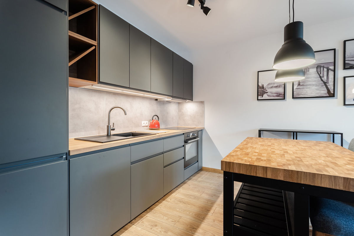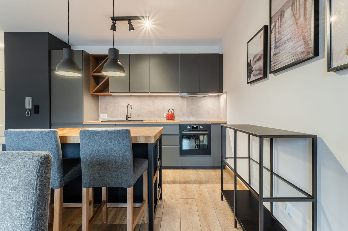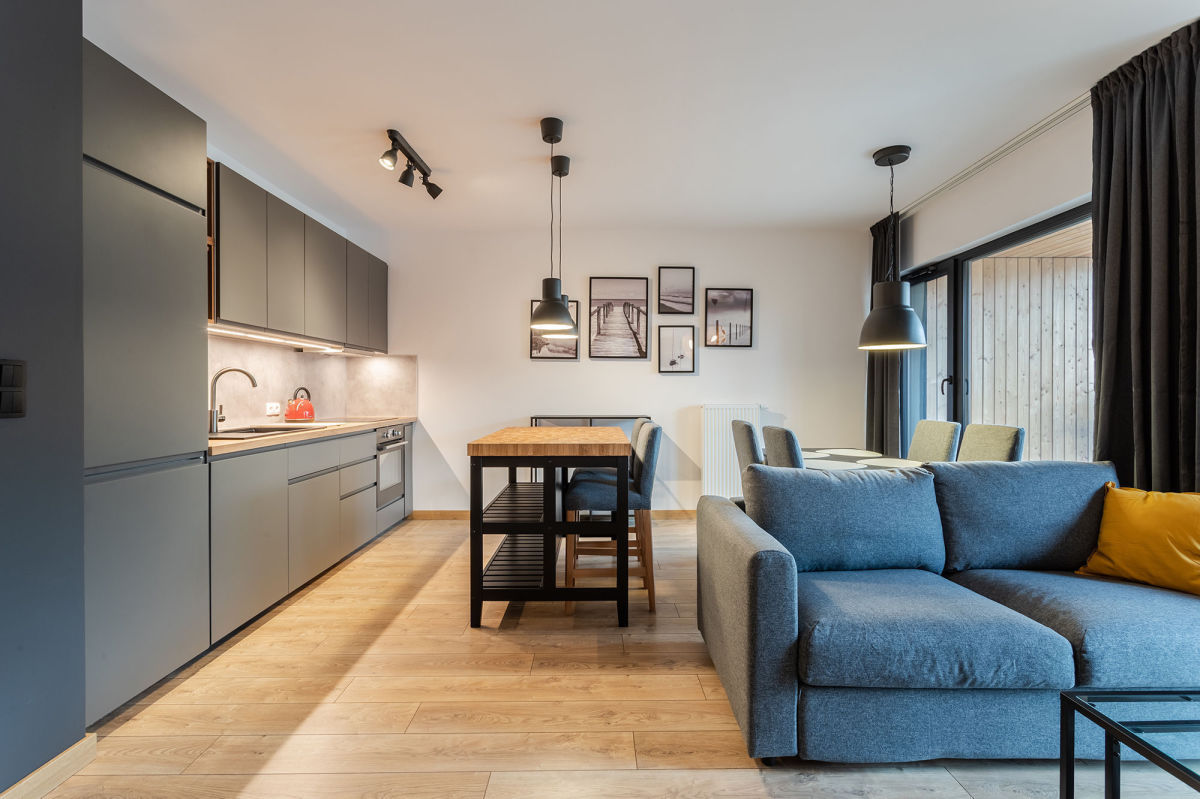 - wyposażonej kuchni (meble kuchenne, lodówka, płyta indukcyjna, piekarnik, zmywarka)