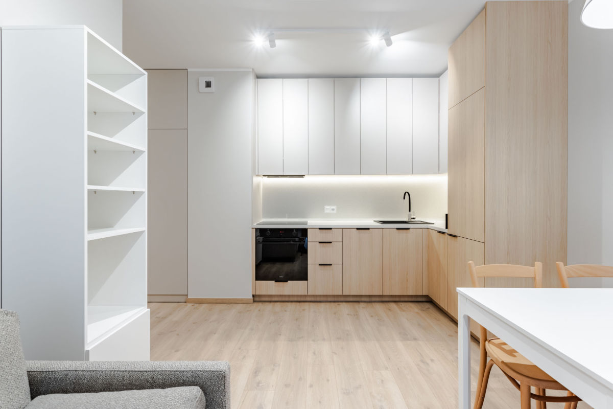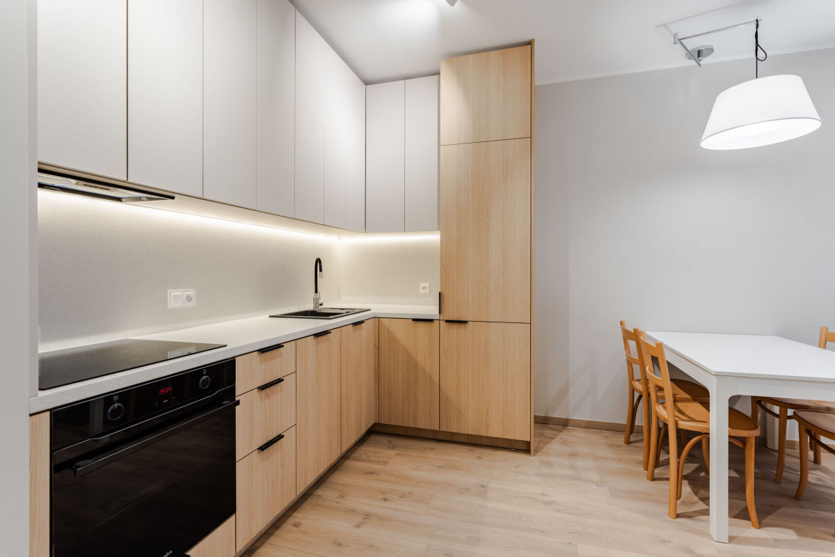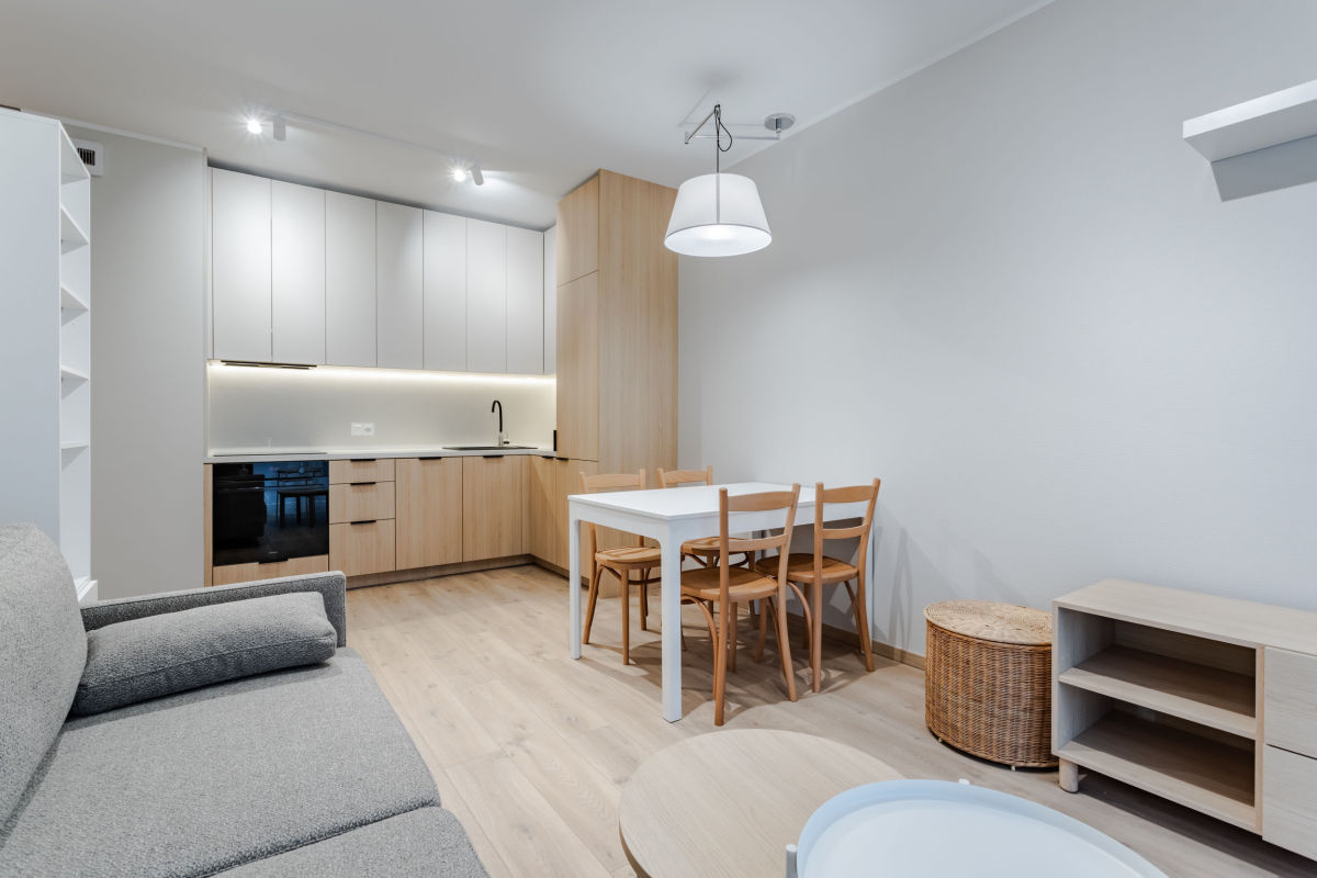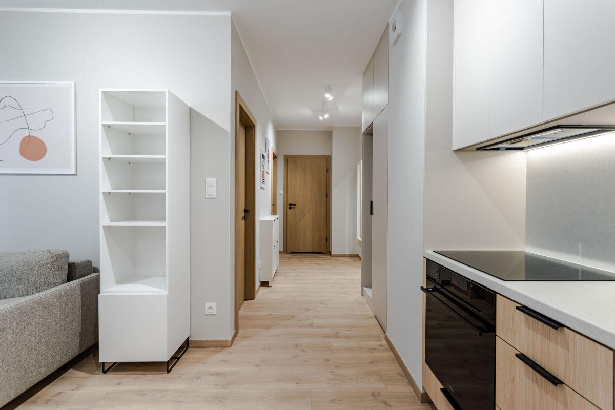 - wyposażonego aneksu kuchennego (meble kuchenne, lodówka, zmywarka, płyta indukcyjna, okap, piekarnik)