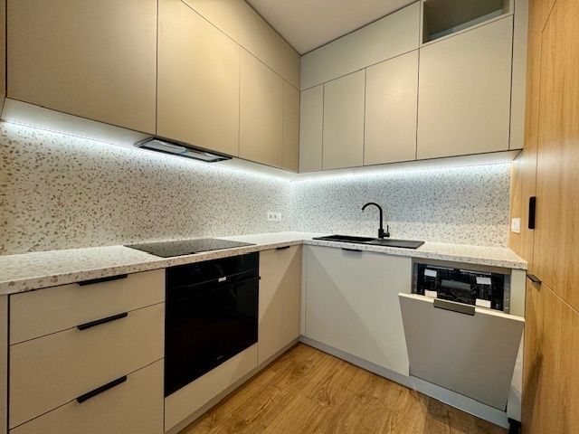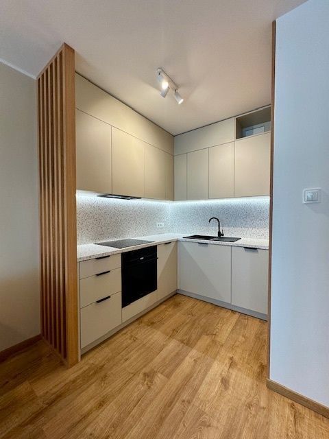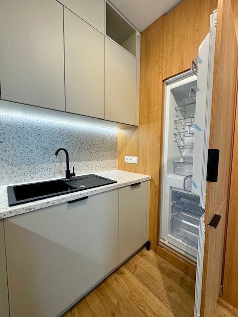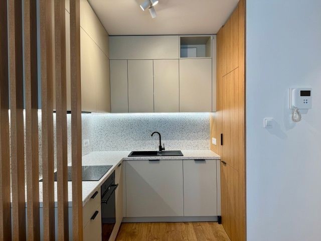 - wyposażonego aneksu kuchennego (meble kuchenne, lodówka, zmywarka, płyta indukcyjna, okap, piekarnik)