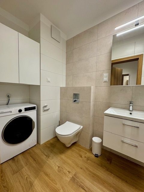 - łazienki z wygodną wanną, wyposażonej w pralkę